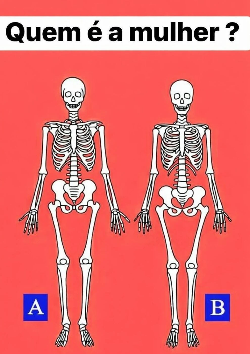 Você consegue resolver esse desafio que está deixando muita gente em dúvida? No novo teste viral do Gênio Quiz: Jogos, Teste e Quizzes Online Grátis, a pergunta parece simples: quem é a mulher? Mas a resposta não é tão óbvia quanto parece. A imagem mostra dois esqueletos, identificados como A e B, e a missão é analisar os detalhes para descobrir qual deles representa uma mulher.